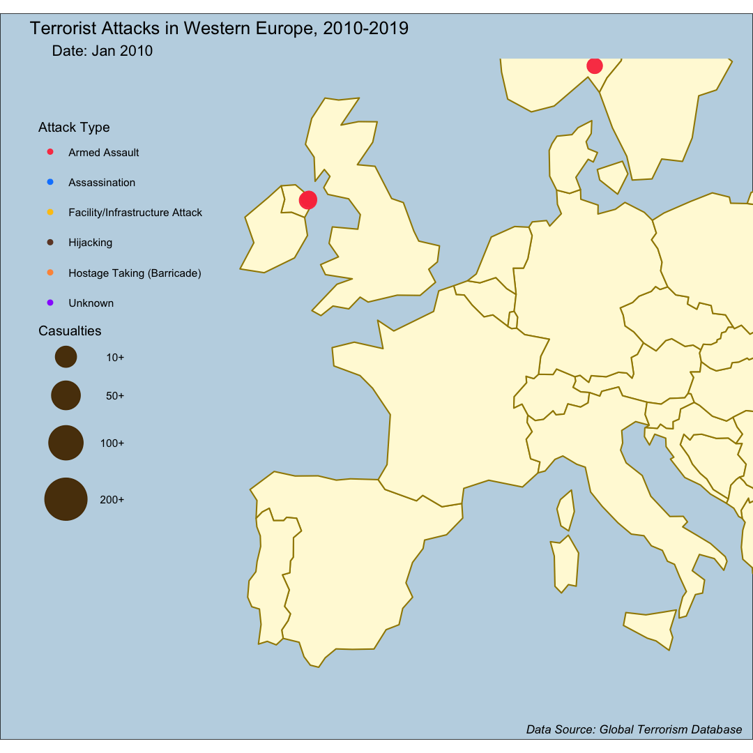 Data visualization project analyzing terrorist attack patterns in Western Europe from 2010-2019.